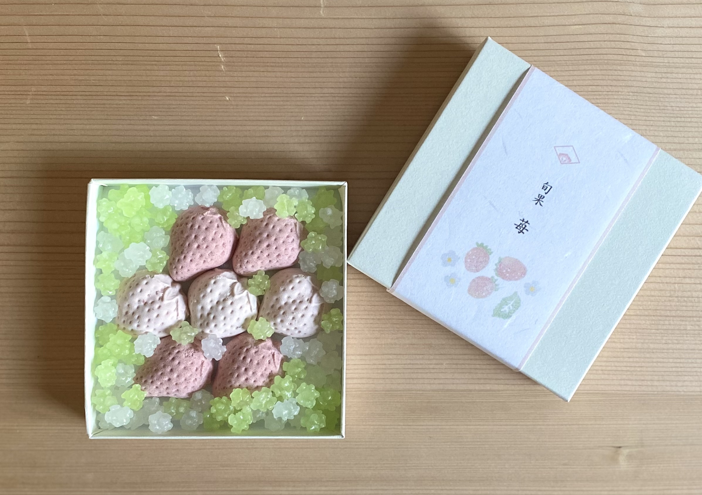 いちご畑をイメージした緑と白の金平糖と一緒に詰め合わせています。
